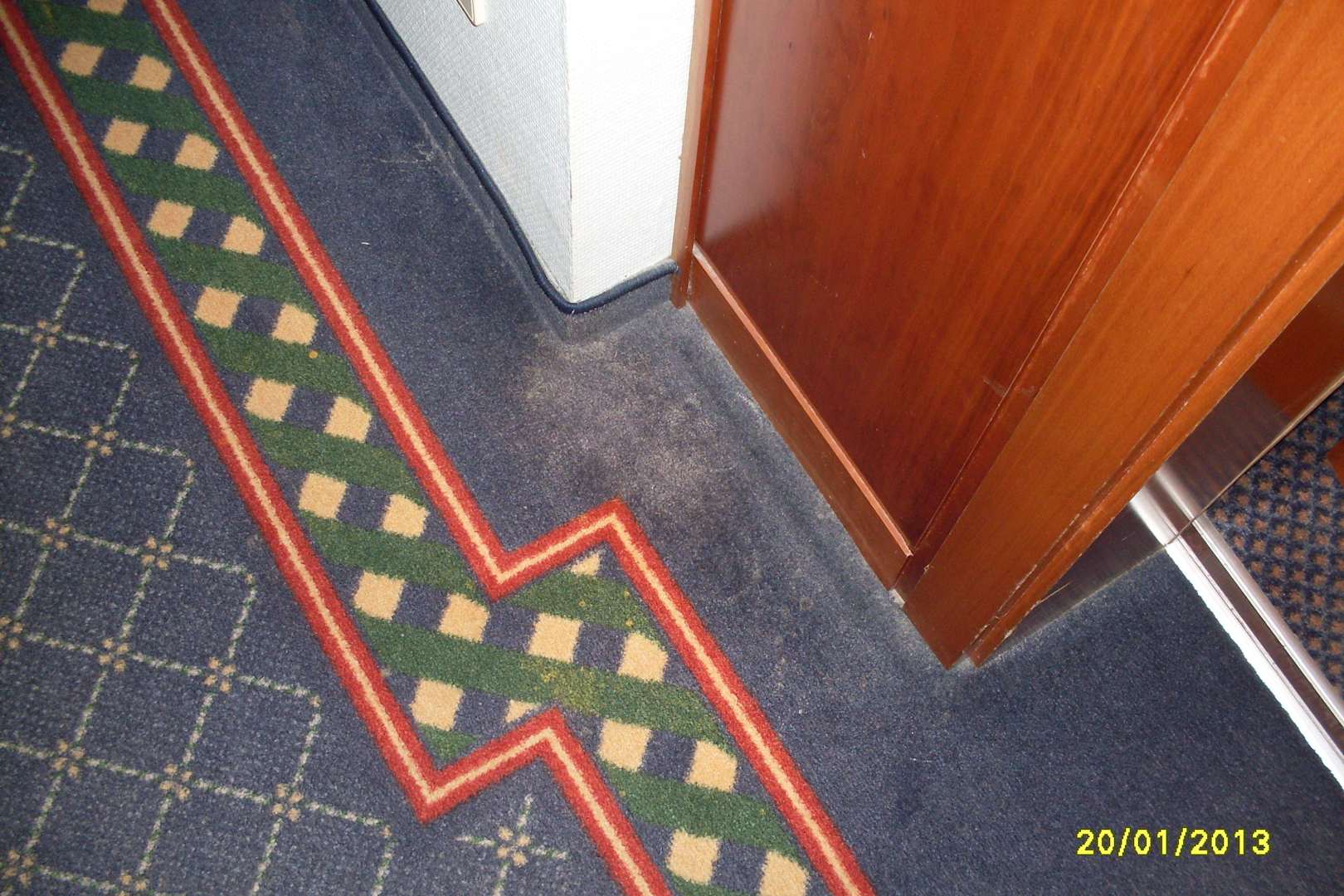 Teppich im Flur mit vielen Flecken.