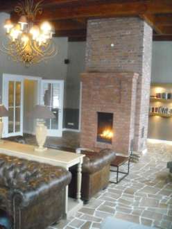 eines der Kaminzimmer im Wellnessbereich mit anschließender Terrasse