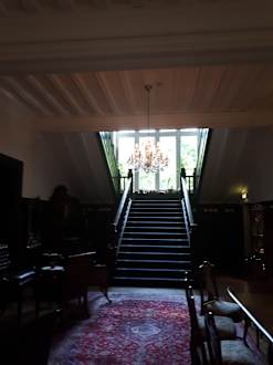 Große Halle mit dem Kamin, Sitzgelegenheiten und Durchgang zum Restaurantbereich.