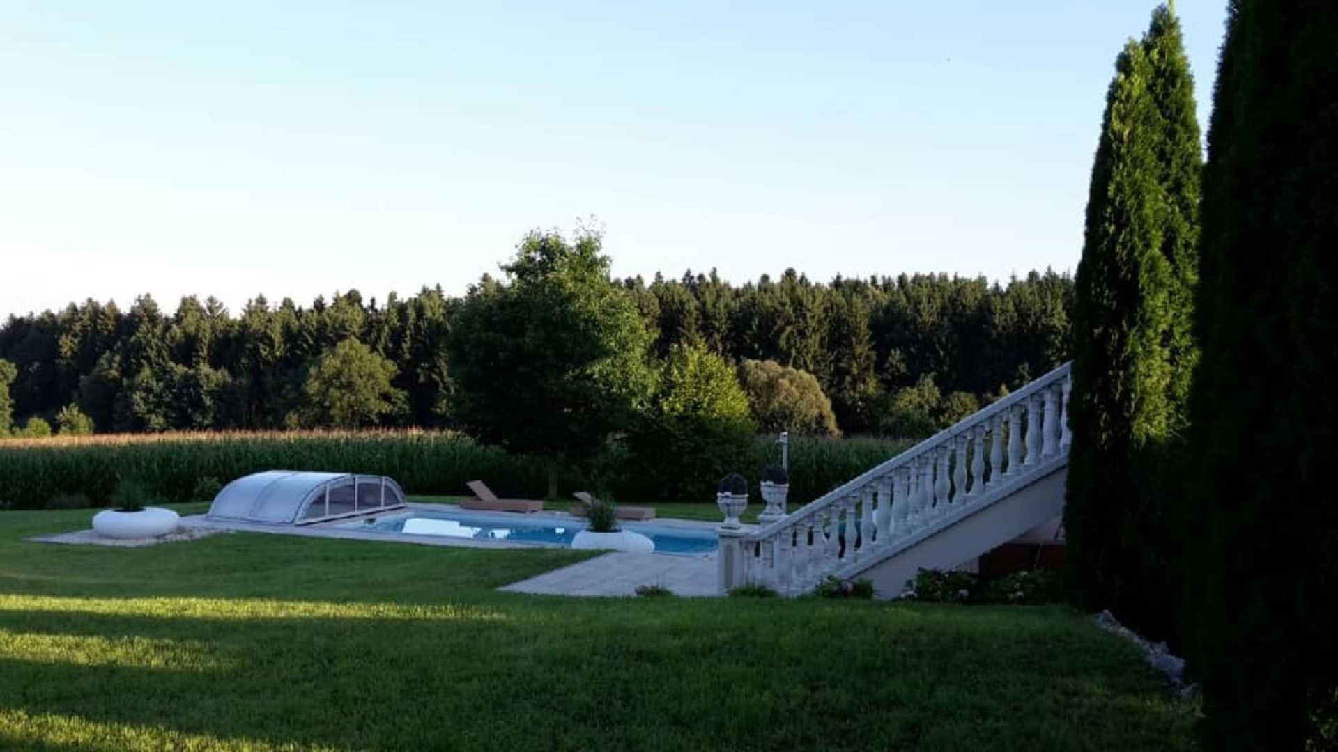 Blick auf Liegewiese und Pool