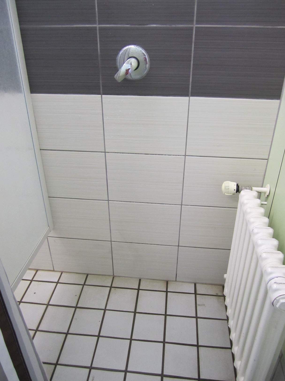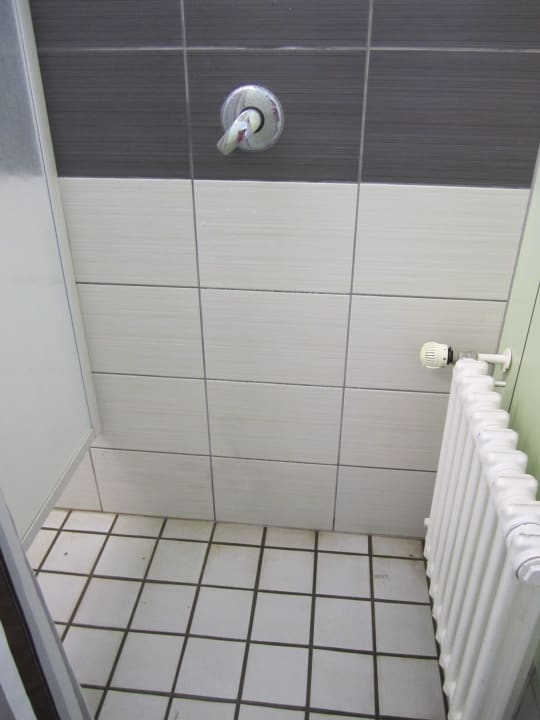 Duschen mit Heizung, Dreck und knöchelhoch Wasser