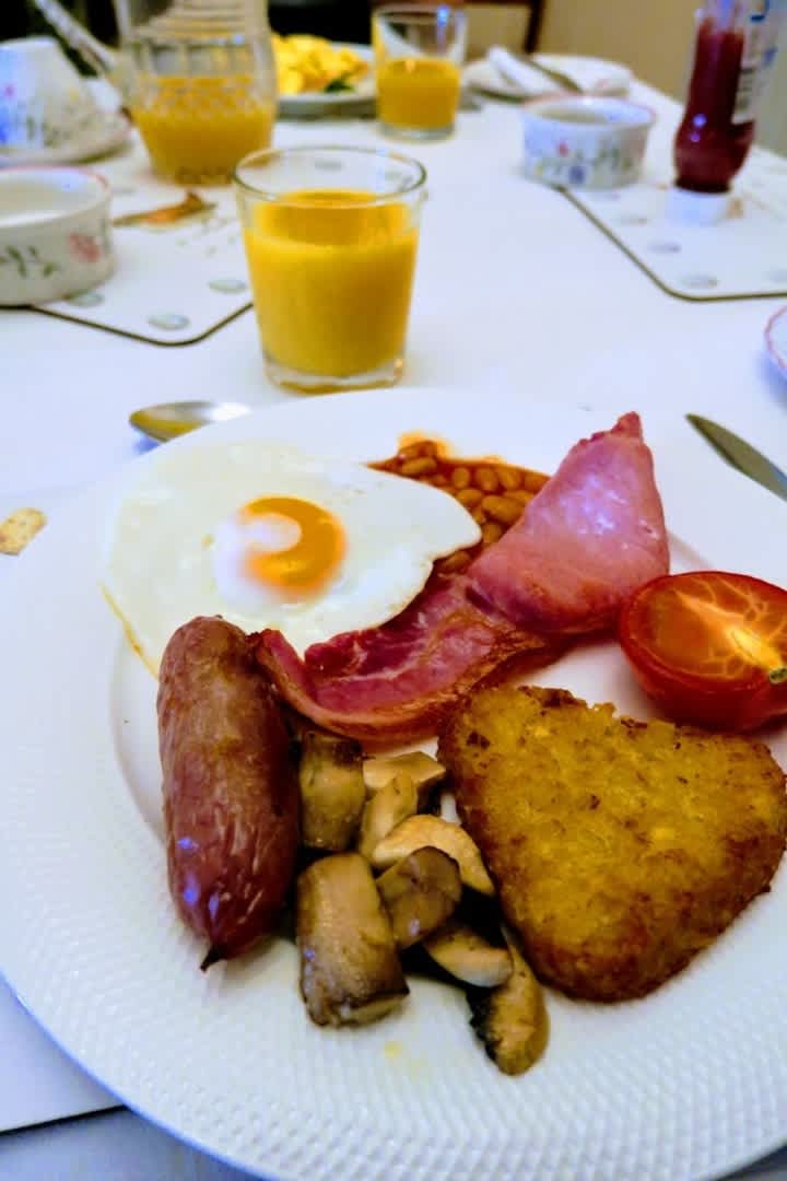 GastroFull English Breakfast. Es gibt auch Milch mit Müsli, Konfitüre, Saft, Kaffee oder Tee nach Wunsch und die Gastfamilie geht auf Wünsche ein.