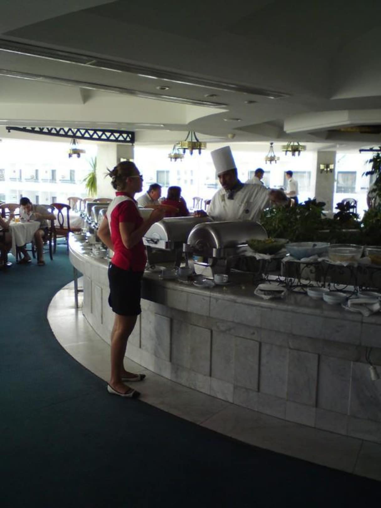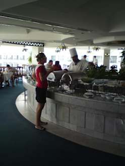 Küchenchef serviert persönlichDer nette Küchenchef hilft den Gästen persönlich bei der Auswahl des Essens.