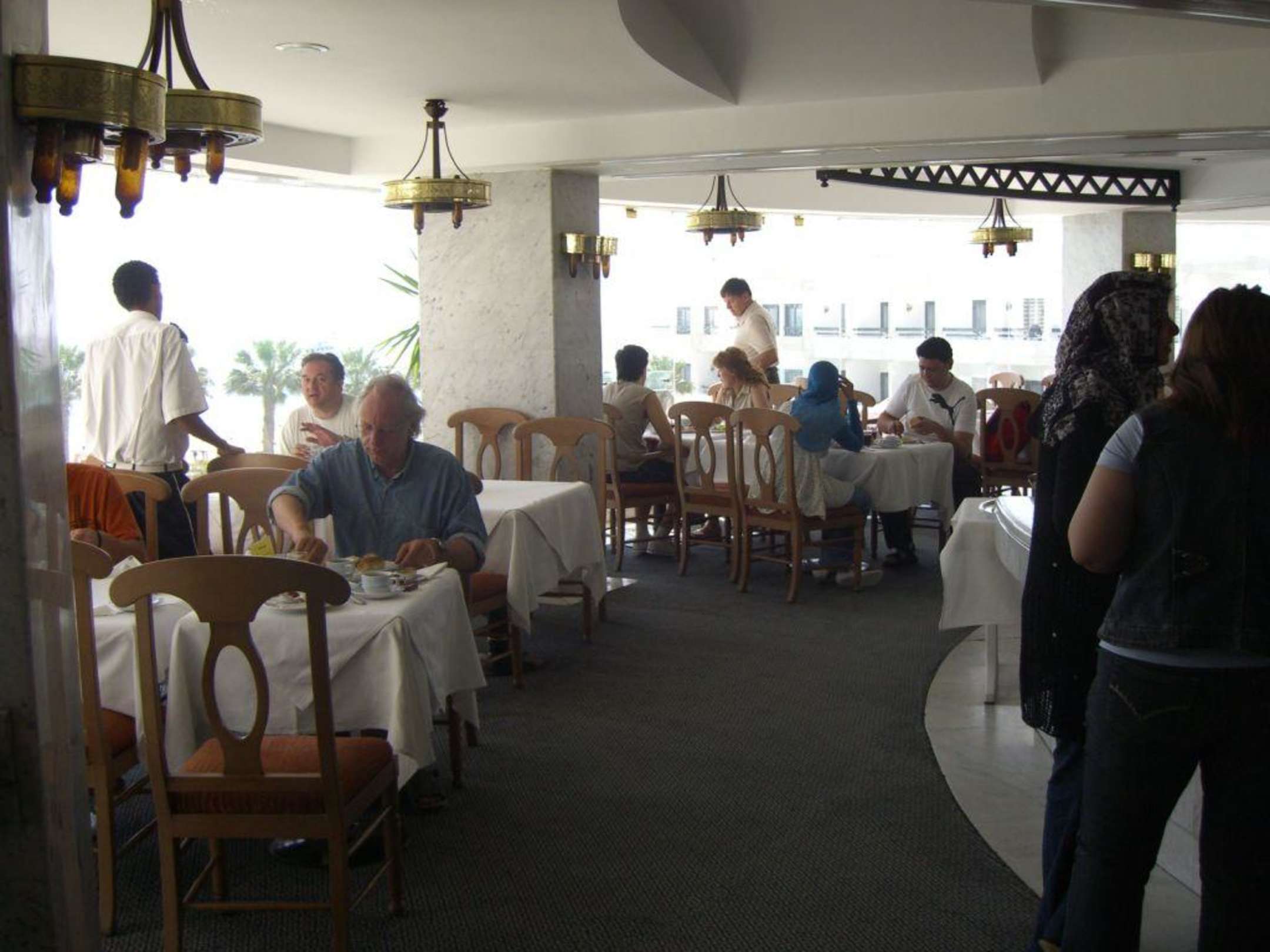 Oval gehaltener Speisesaal, meistens bekommen Sie den Platz, an dem Sie sich persönlich am ersten Tag ausgesucht haben, auf der selben Etage befinden sich auch Toiletten. Gaderobe bequem-leger.