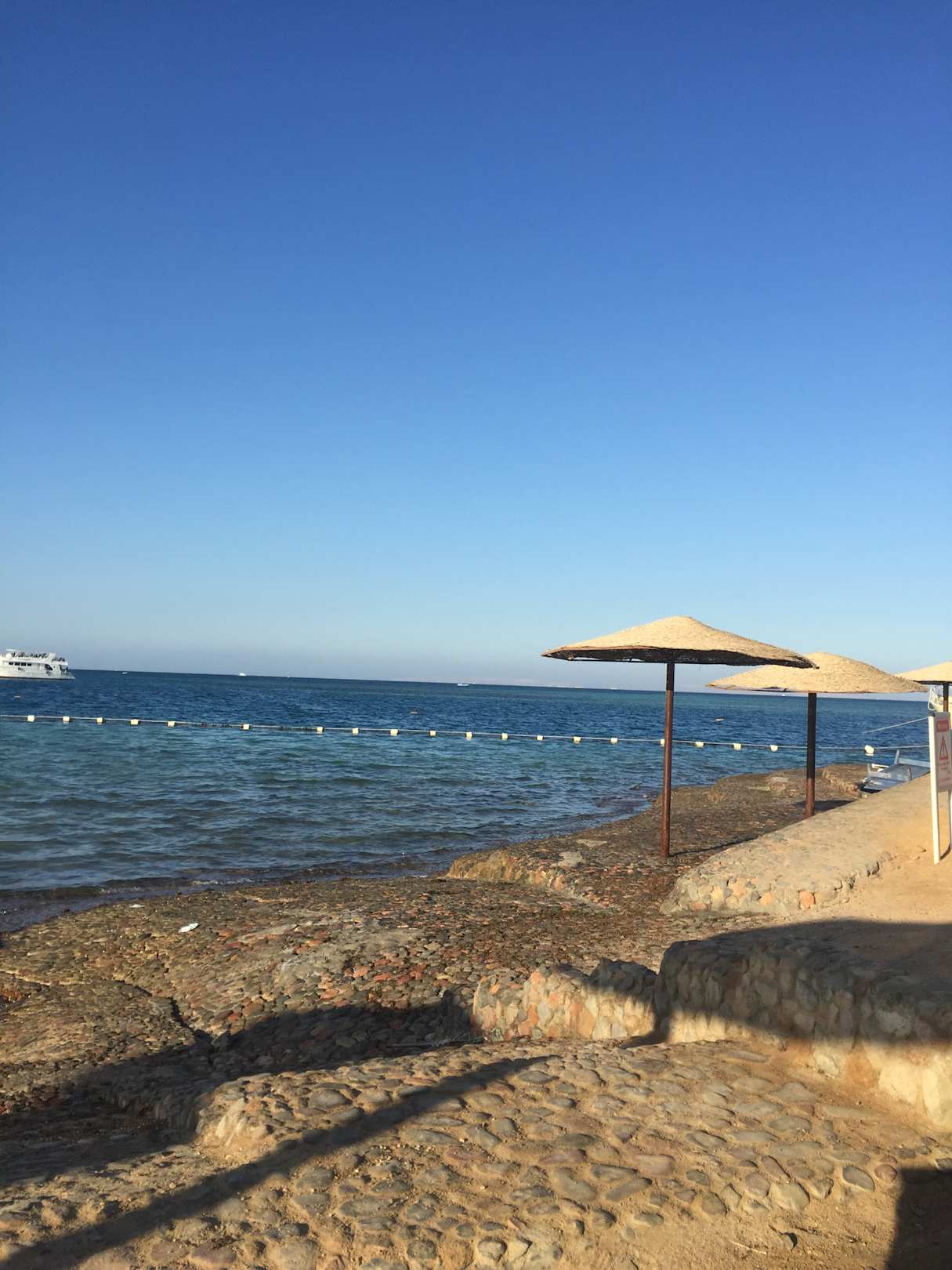 Am Strand gibt es auch Plätze die mit Steinen gepflastert sind für Leute die nicht gerne im Sand ihre Liege stehen haben aber auch den üblichen Sandstrand.