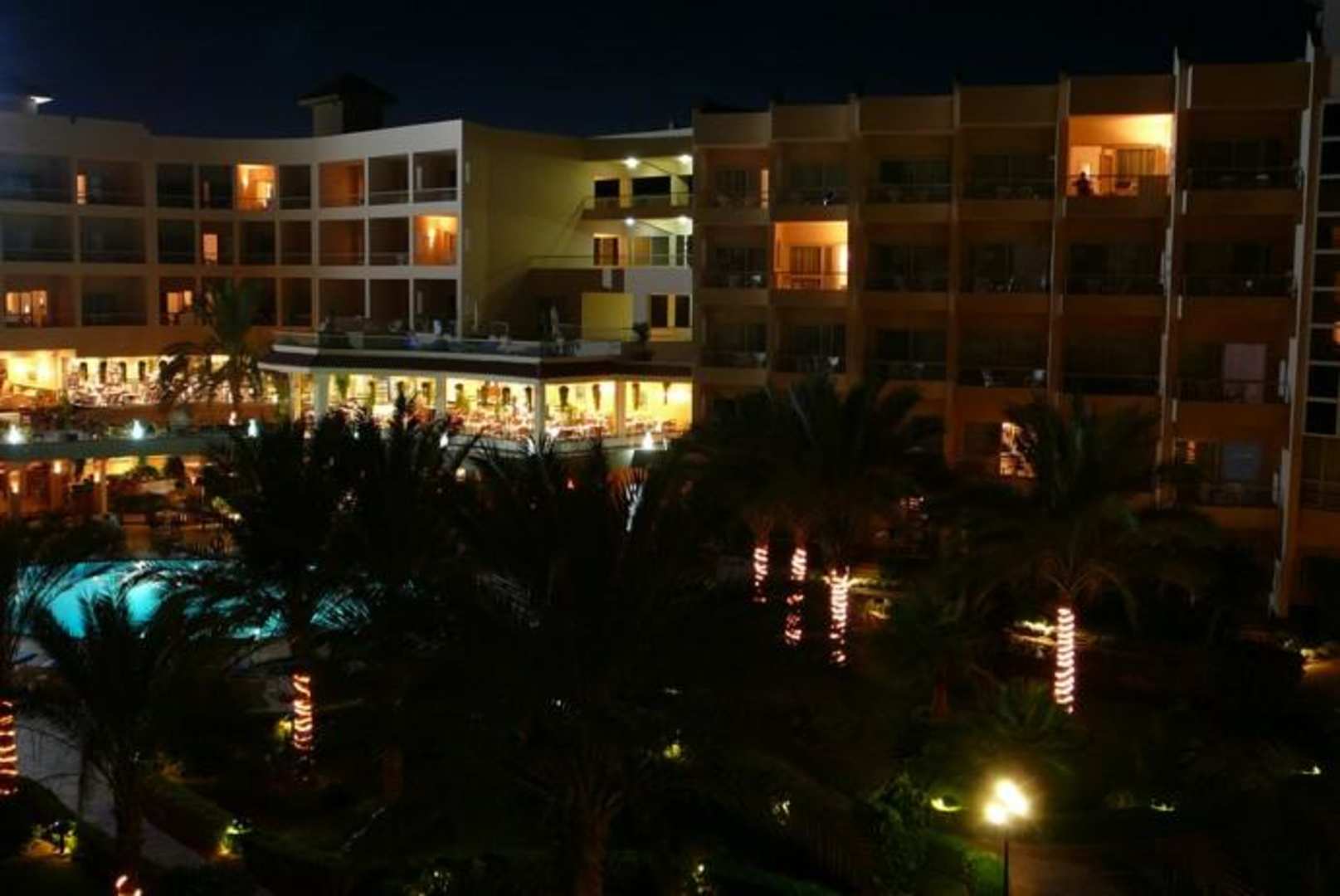 Nachts Blick auf Haupthaus mit Restaurant