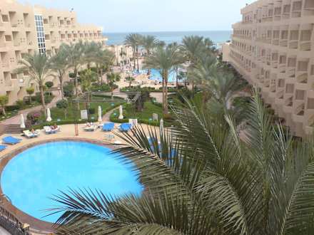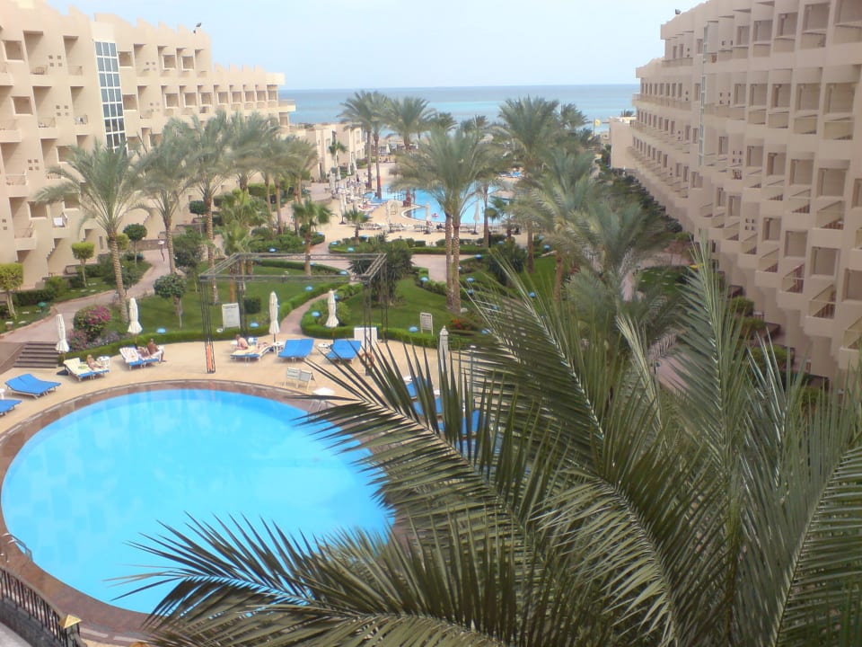 Blick vom Balkon auf beide Pools und das Meer