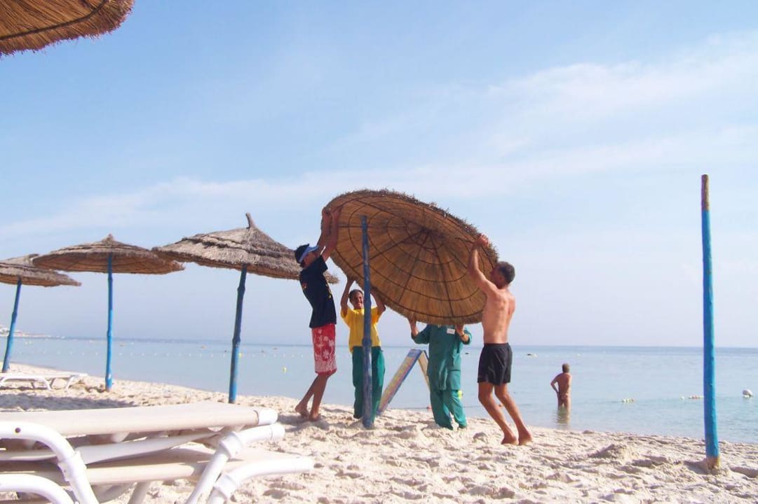 Sonnenschirme am Strand werden aufgestellt