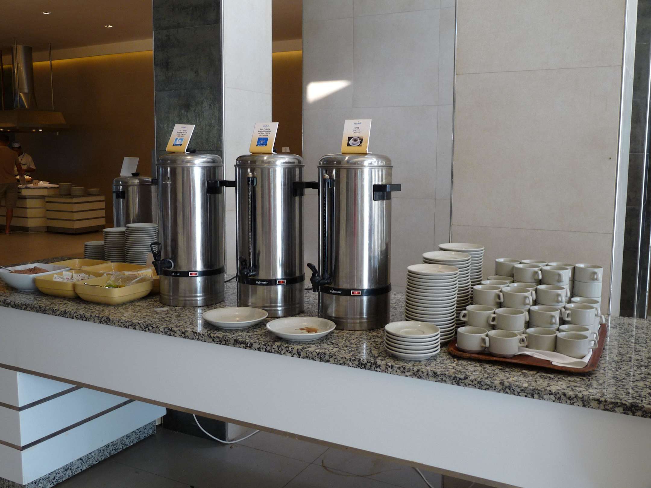 In solchen Behälter ist Kaffee, warme Milch und warmes Wasser zu holen. Kaffee ungeniessbar. Nach Auskunft des Restaurantmanager, ein löslicher Kaffee, Nescafe, aus USA.