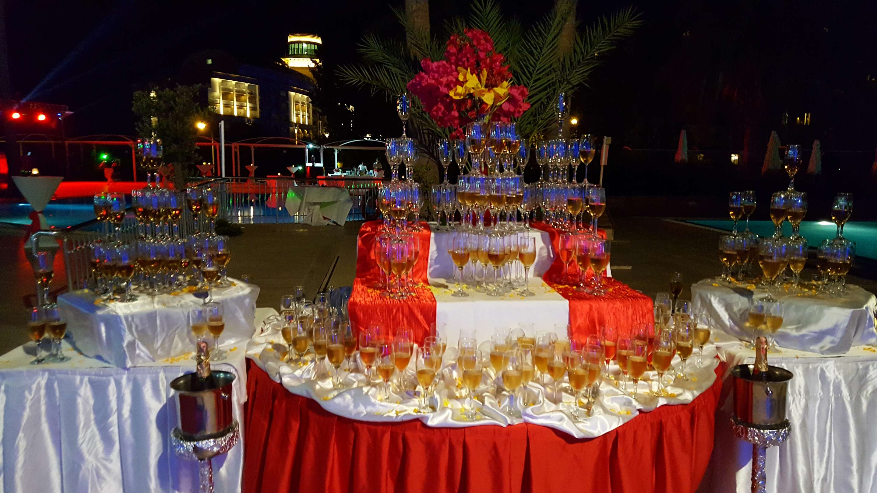 Abendliche Dekoration zu Beginn der Schaumparty am Pool.
