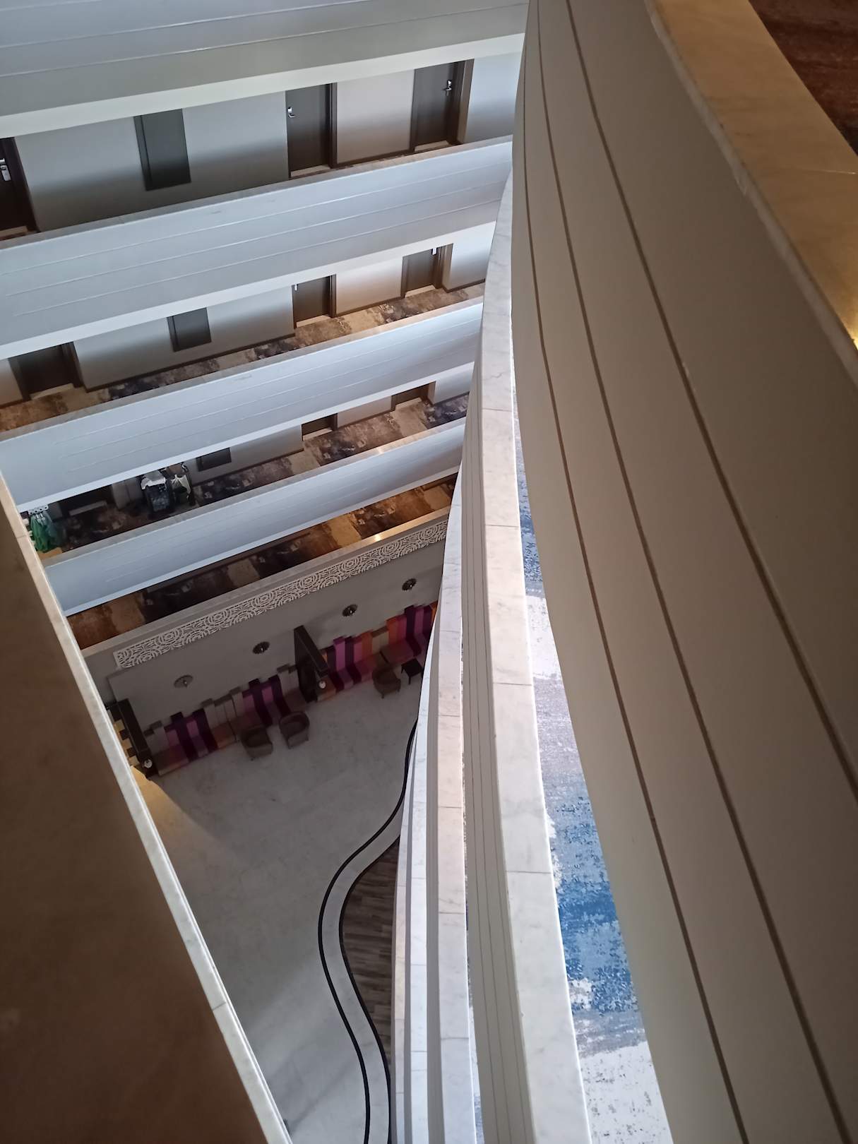Fas Hotel hat 9 Stockwerke insgesamt. Manchmal ist der Blick nach unten gruselig. Hier von einem Gang im Stockwerk 9 hinuter auf einen Nebenraum der Lobby, Stockwerk 3.
