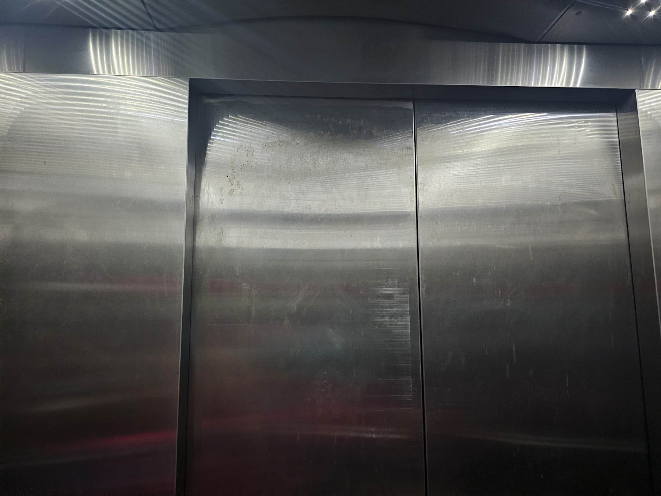 Die Aufzugsinnenwände (alle Aufzüge sehen so aus) mit undefinierbaren braunen Flecken.