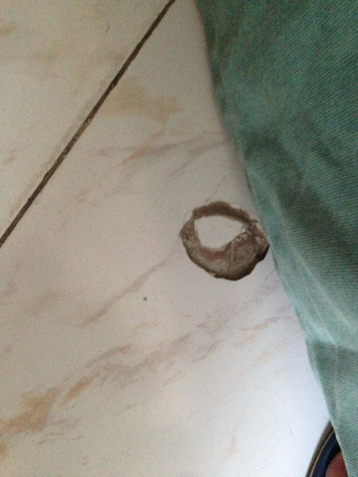 Kaputte scharfkantige Fliese direkt neben dem Bett.
