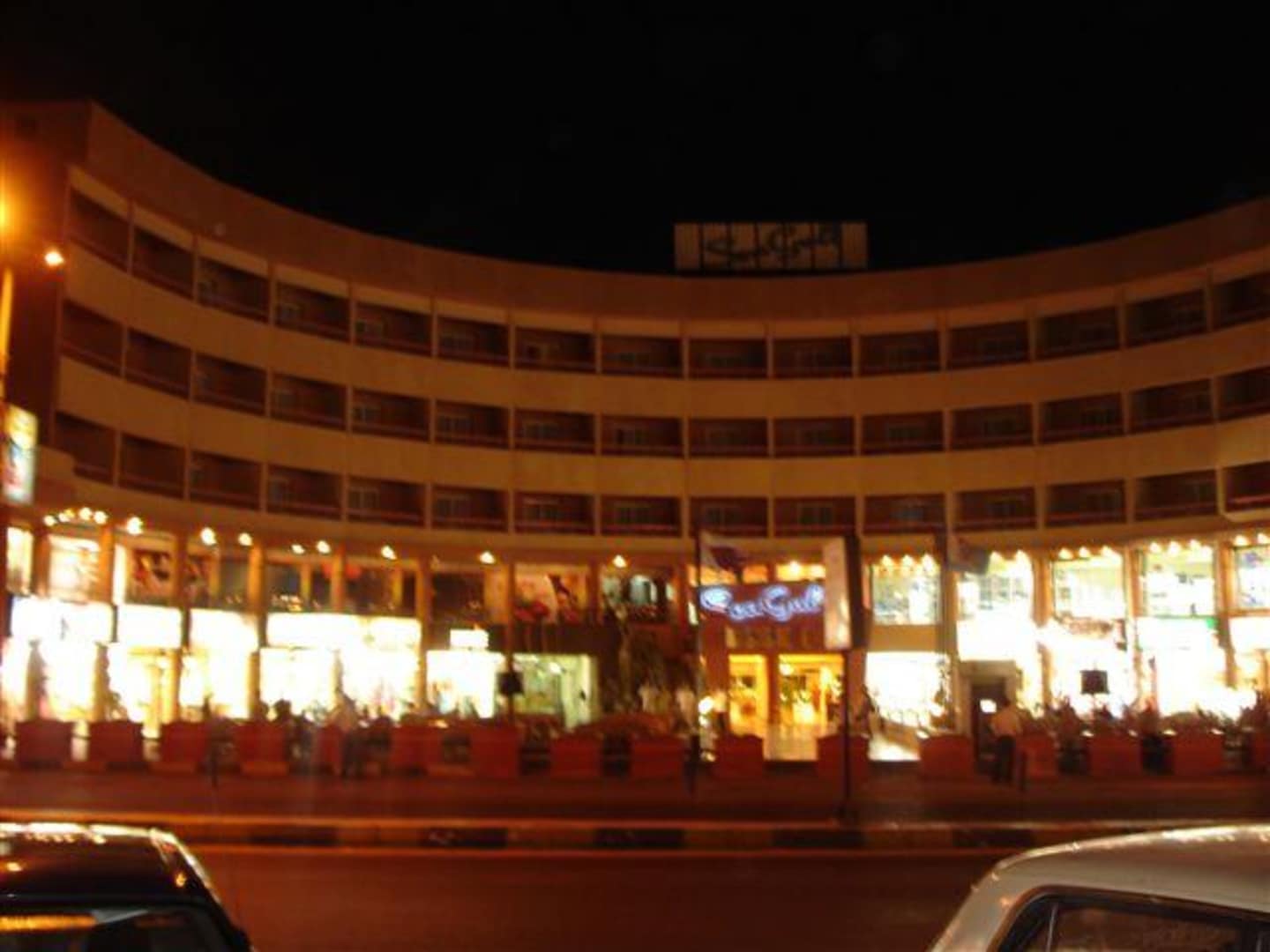 Der Eingang wird li.u.re.von Geschäften gesäumt.Davor stehen viele Stühle,von wo aus mann Fernsehen kann.Ist am Abend immer gut besucht.