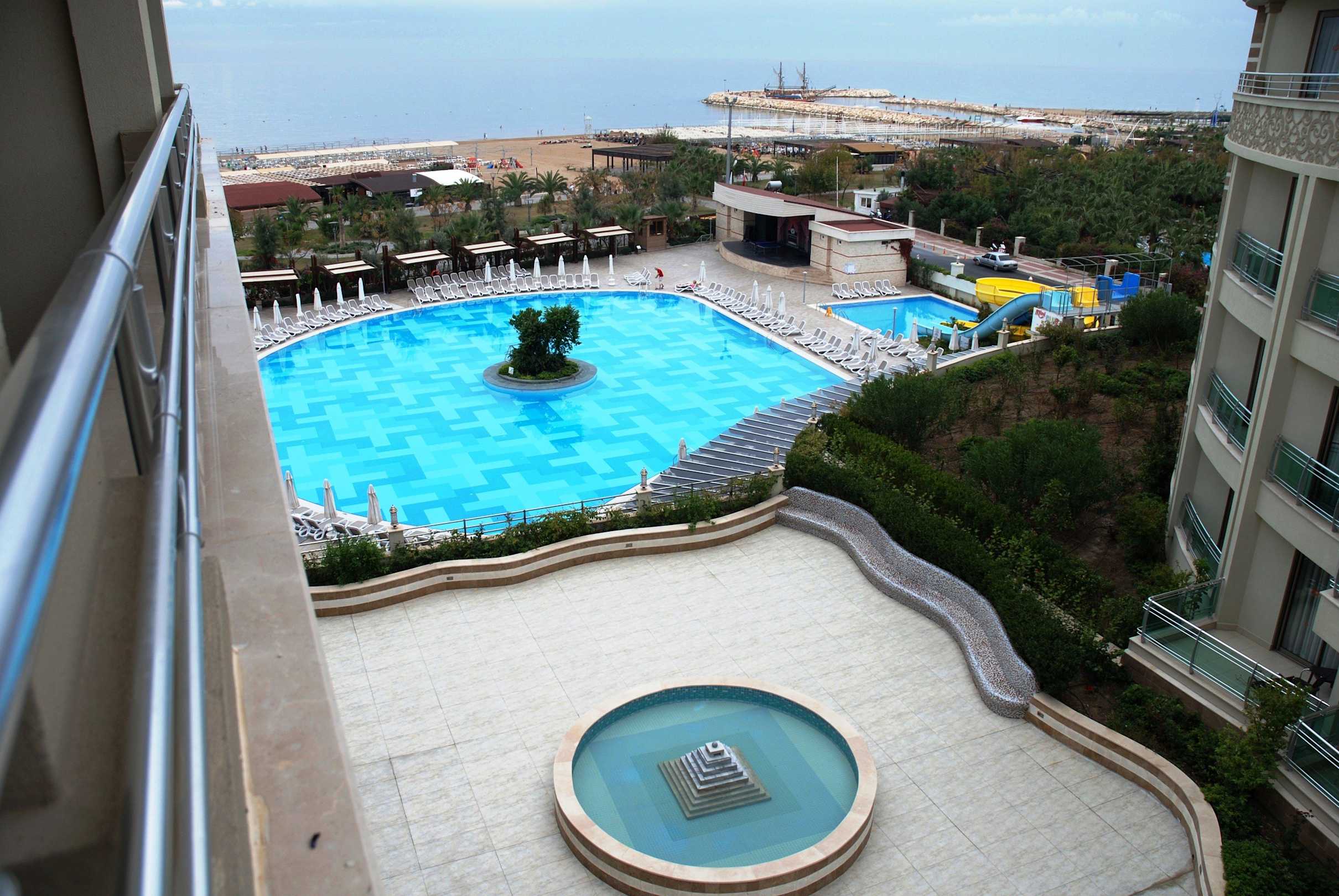 Blick auf Hotelpool Strand und JachthafenDer hoteleigene Pool mit Blick auf die Strandpromenate, Strand, Mittelmeer und den kleinen Jachtenhafen