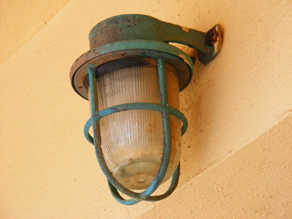verrostete Außenbeleuchtung bei erst neu renoviertem Zimmer