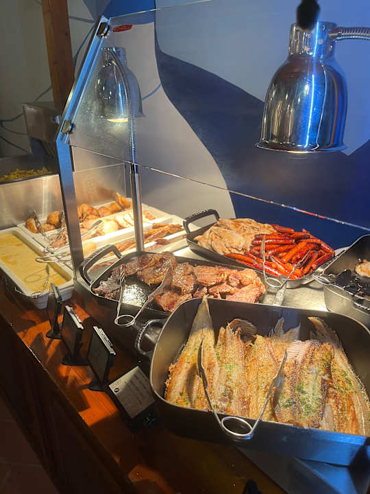 Hier bündeln sich die Speisen in eingeschränkter Auswahl, die normalerweise über 4 Live cooking Stationen verteilt sind. Bescheidene Qualität. Lauwarm bestenfalls.