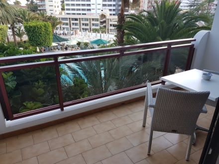 Balkon mit Blick auf Pool und Poolbar