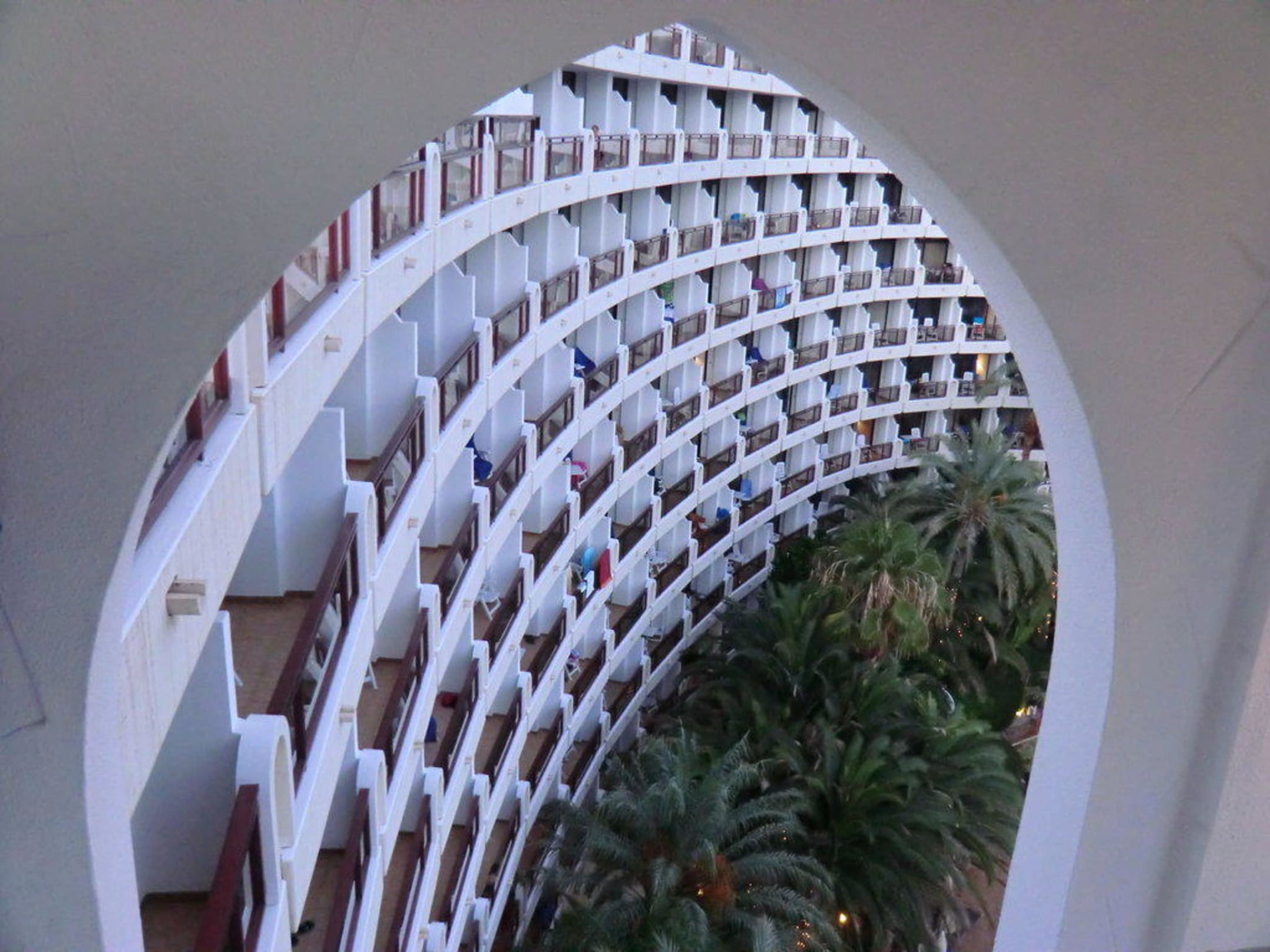 Ausblick vom offenen Treppenaufgang in den Innenbereich des Hotels. Wunderbar die Architektur