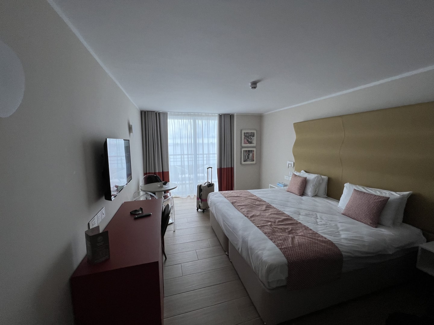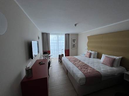 ZimmerGroßes Doppelbett, das easy in zwei Einzelbetten geteilt werden kann. Links der Flatscreen mit Streaming-Funktion sowie Sitzgelegenheiten. Auf der rechten Seite (nicht im Bild) ist ein Schrank mit Kühlschrank, Kaffeemaschine, Wasserkocher und Safe.
