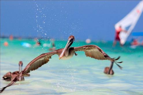 Pelikane am Hotel-Strand