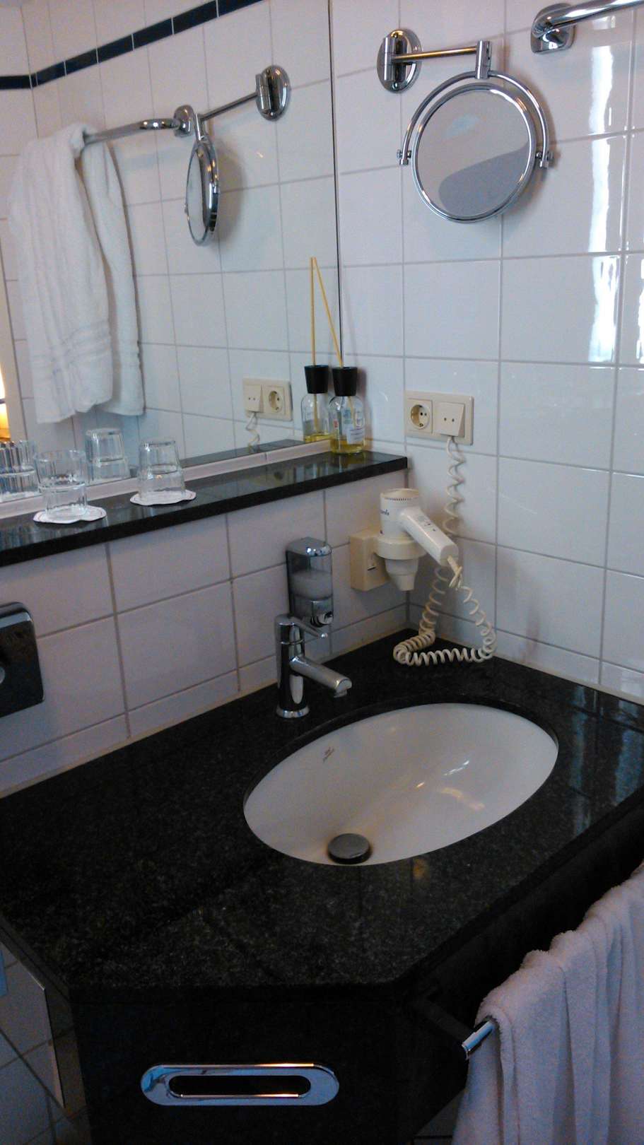 Waschbecken mit Vergrößerungsspiegel, Fön etc.