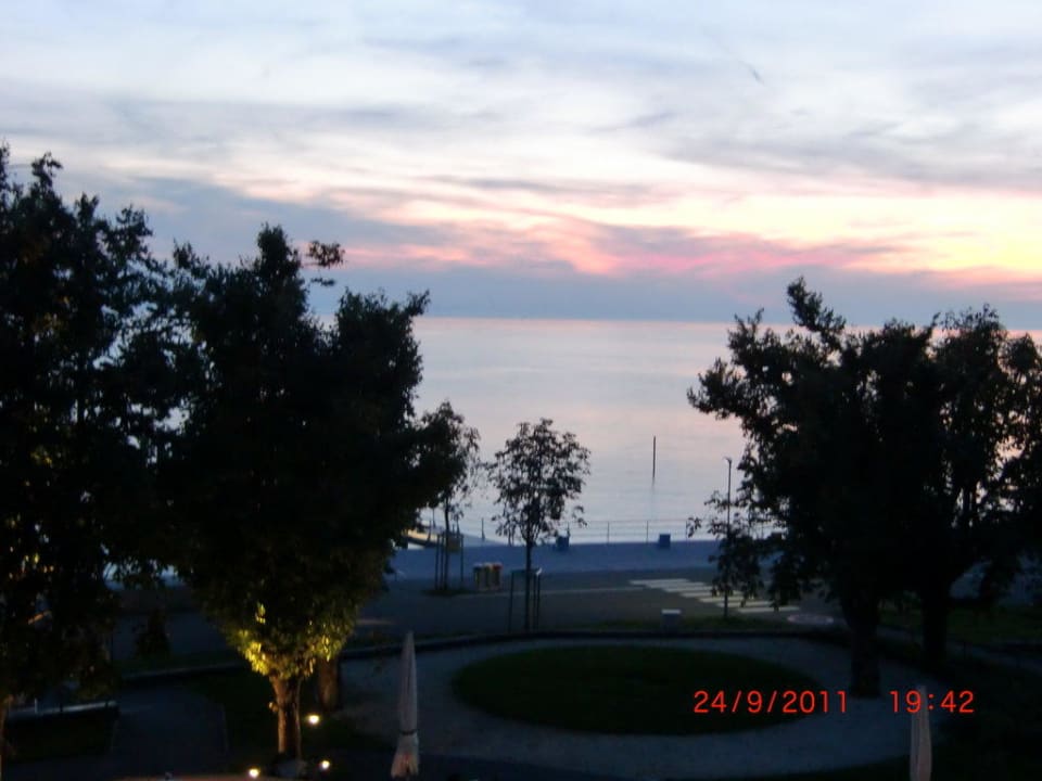 Blick vom Zimmer auf den See nach Sonnenuntergang