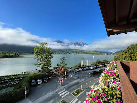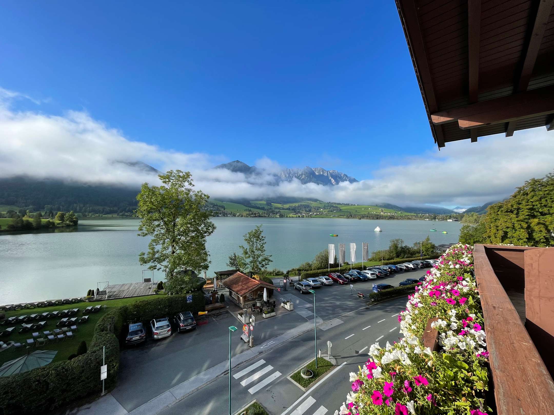 Blick vom Balkon auf den Walchsee, Parkplatz und Hotelstrand
