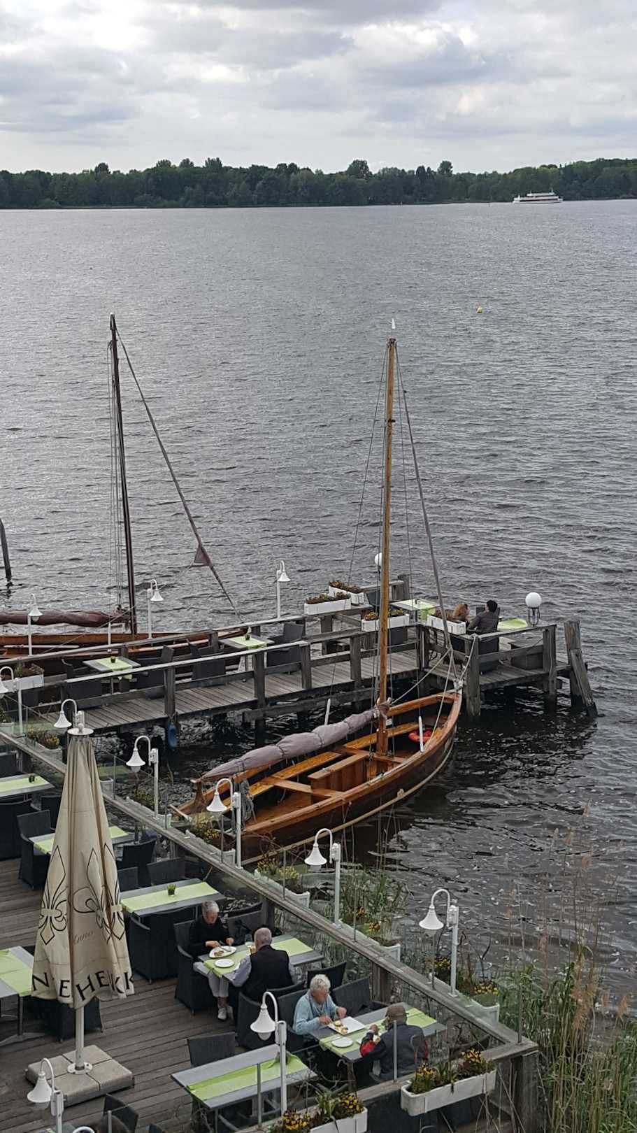 Blick vom Balkon auf die Aussenterrasse und den See.