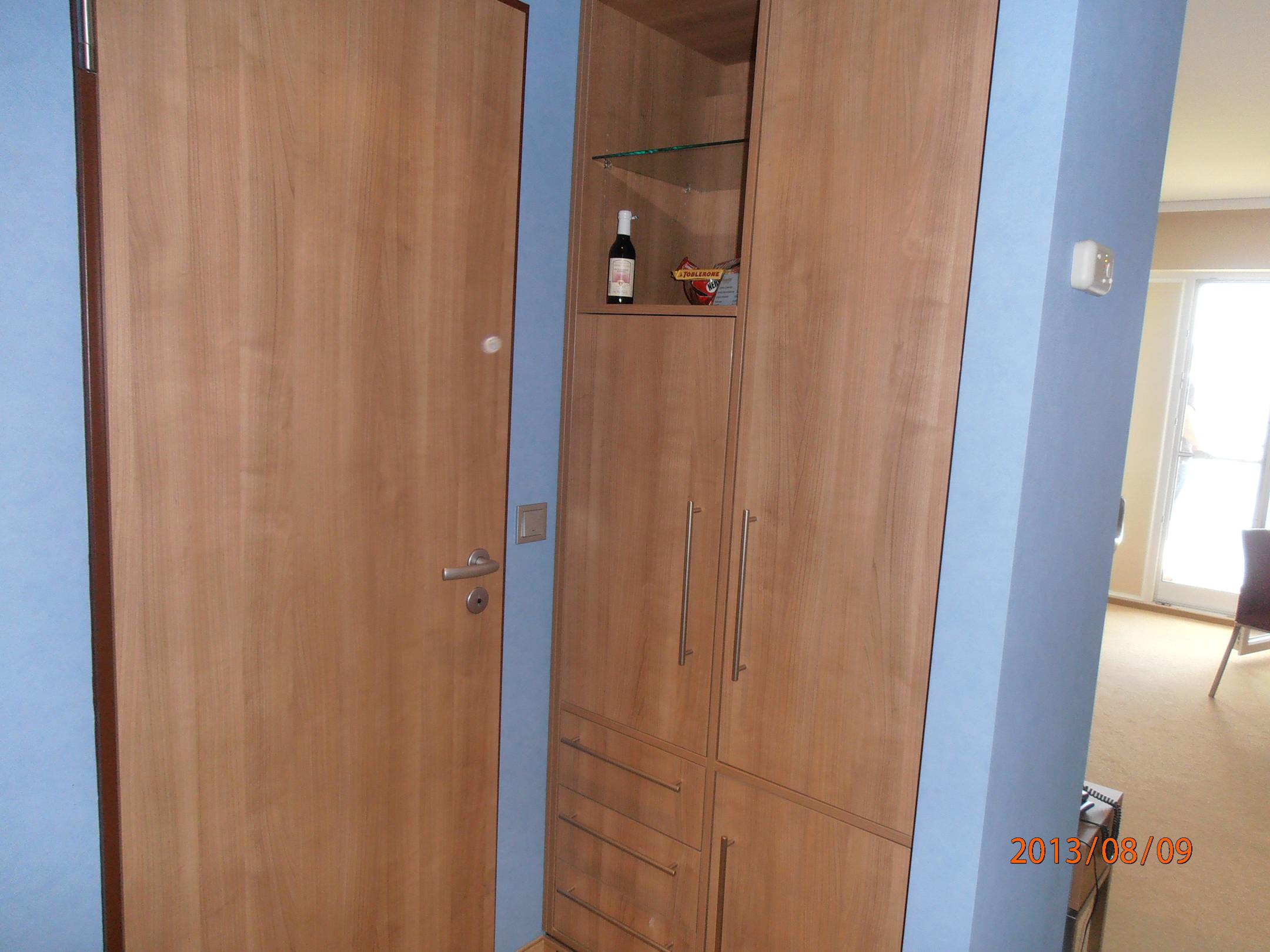 Tür zum Bad, Minibar und Schrank