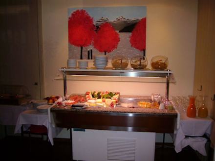 Frühstücksbuffetsehr reichhaltiges Frühstücksbuffet mit verschiedenen Sorten Käse, Wurst, Müsli und frisches Obst. Es gibt Orangensaft und Multivitaminsaft, verschiedene Brötchen und Brotsorten. Auf einem seperaten Tisch im Frühstücksraum stehen mindestens 6 Sorten Marmelade in Gläsern, Honig, Nutella, Butter und Margarine, auch für Diabetiker