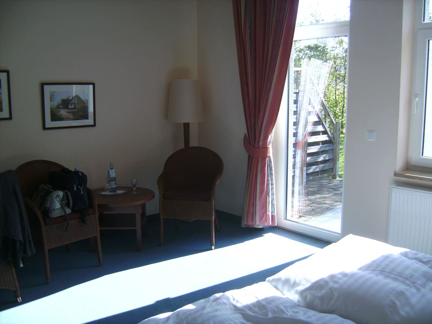 Tisch, 2 Sessel, Doppelbett und Tür zur Terrasse