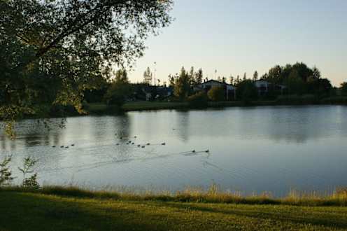 Abendstimmung am SeeBlick von der gegenüberliegender Seite des Sees auf das Hotel bei Sonnenuntergang.