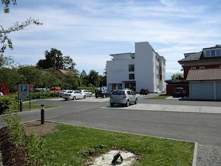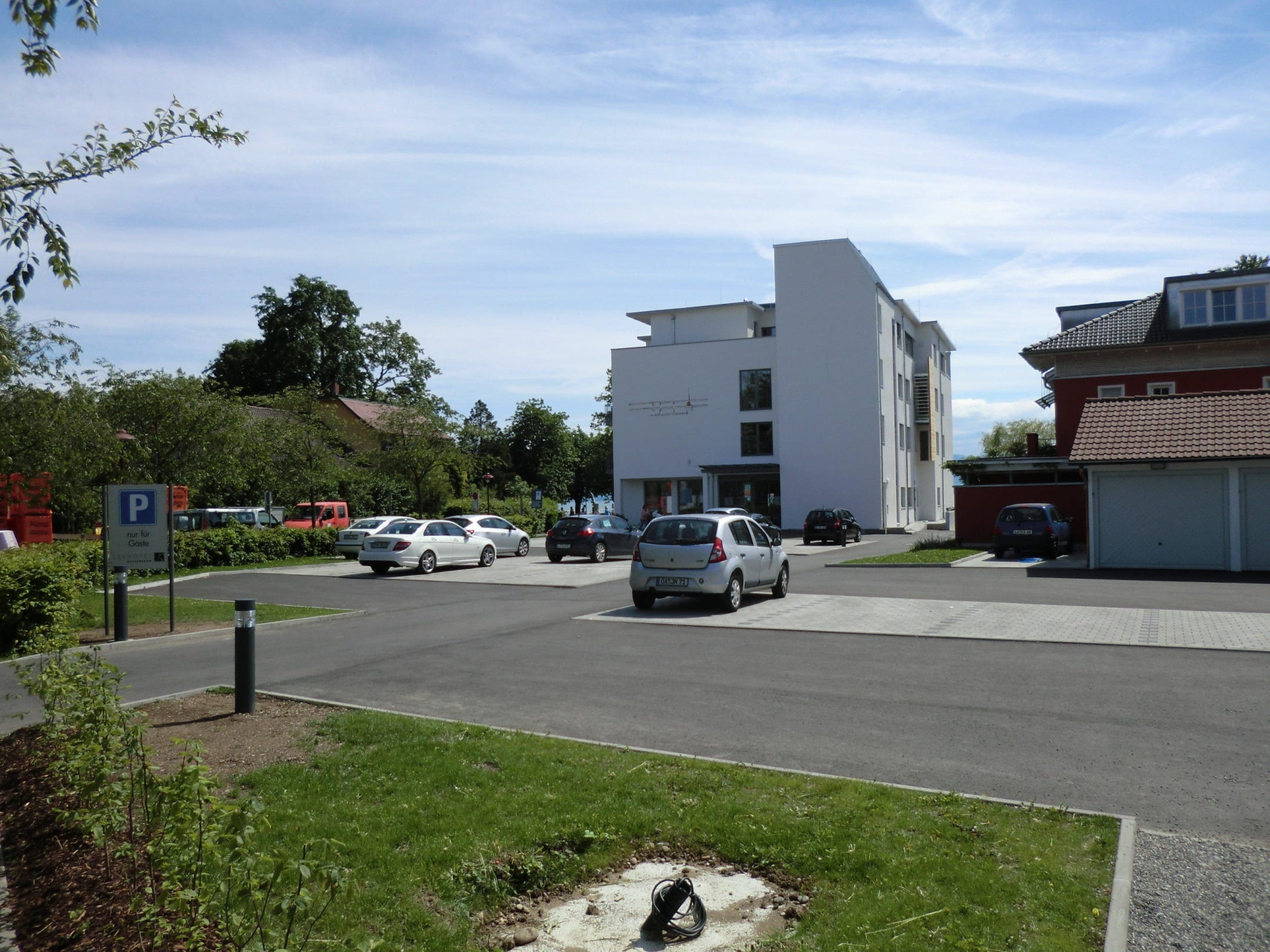Großer Parkplatz, Hoteleingang und TG-Zufahrt.