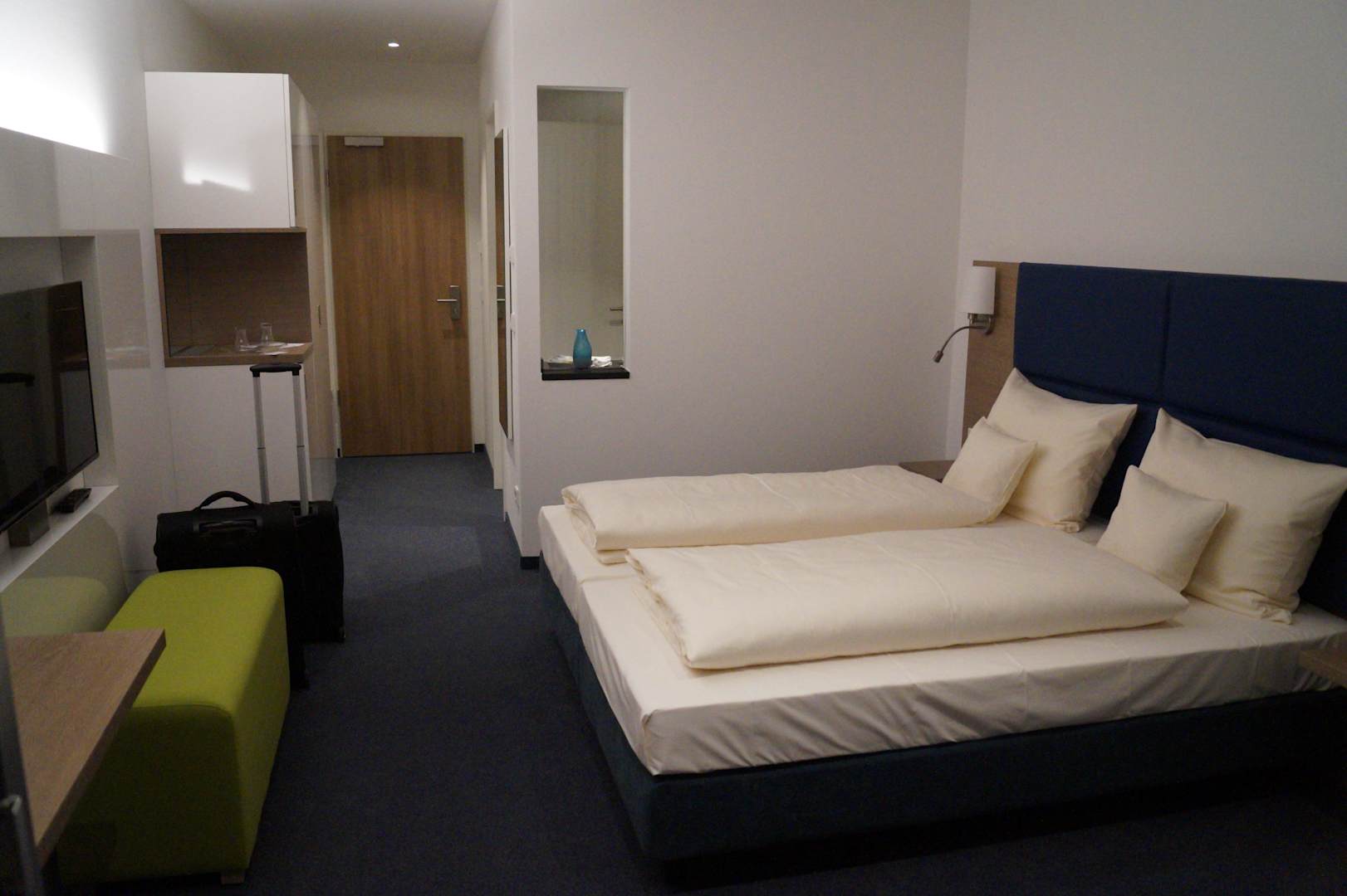 Zimmer abends von der Balkontür aus fotografiert