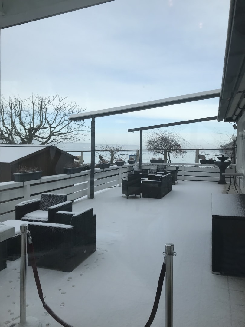 Die verschneite Seeterrasse