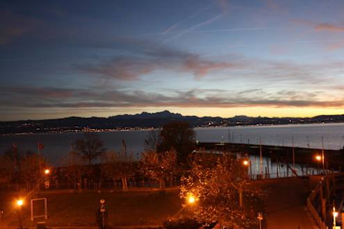 Traumhafter Blick über den Bodensee und auf die Alpen, dort herausragend den Säntis Im Vordergrund der malerische Hafen von Langenargen.