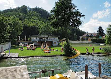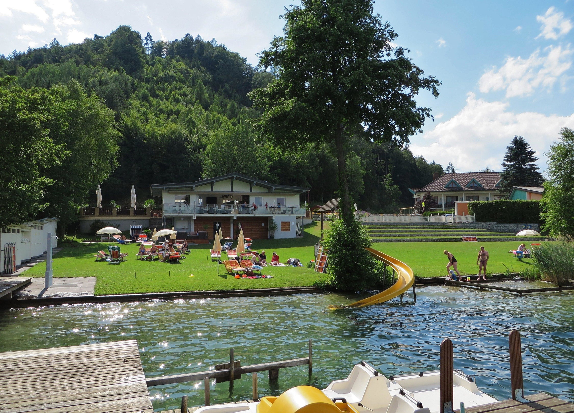 Liegewiese mit Restaurant und Hotel
