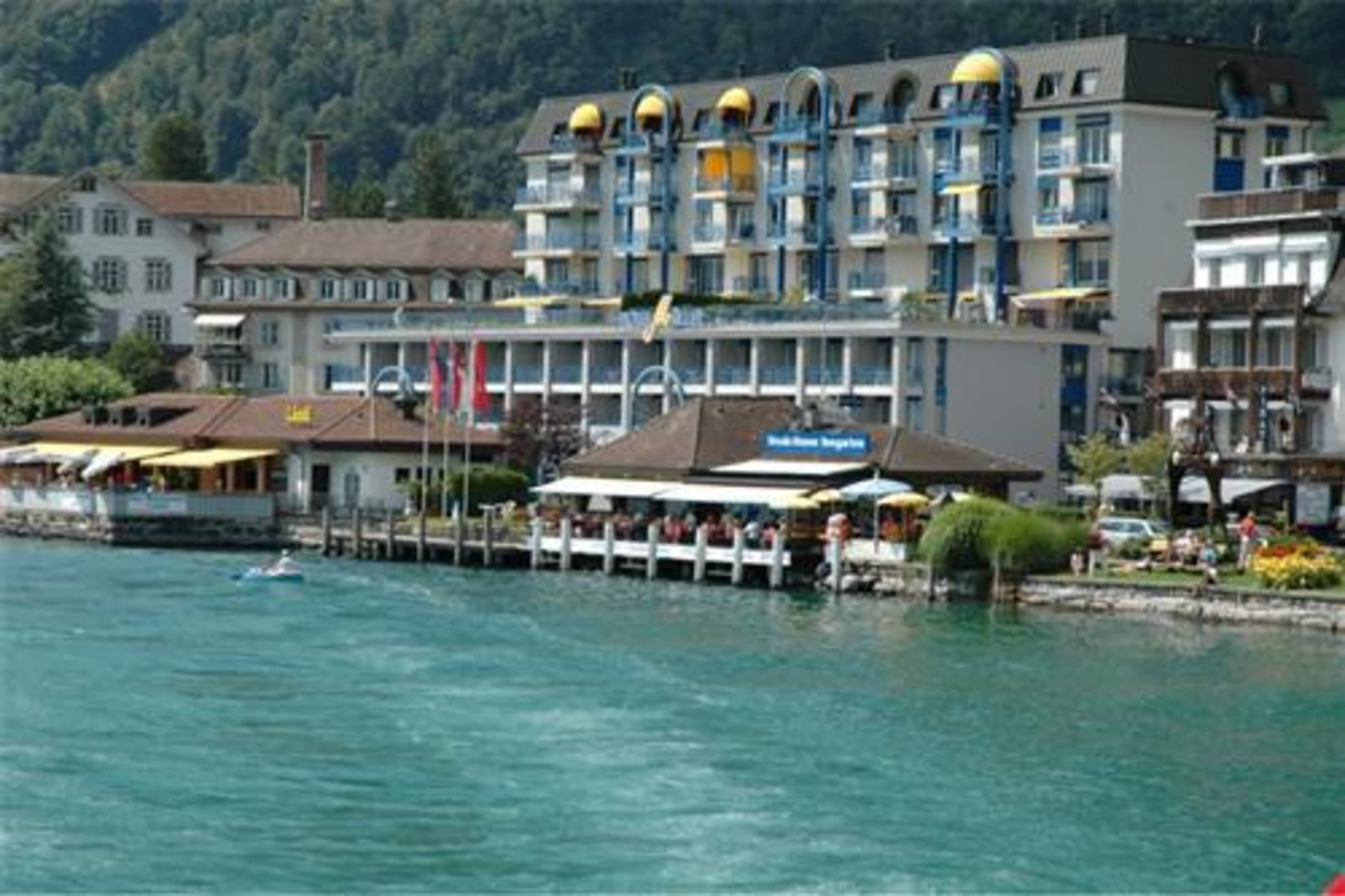 Blick vom See auf das HotelSeehotel Riviera, Gersau, Vierwaldstättersee. Diesen Blick hat man vom See aus auf das Hotel und das zugehörige Grillrestaurant im Vordergrund. Das Hotel ist der 2-stöckige Bau im Vordergrund, dahinter das angeschlossene Appartementhaus.