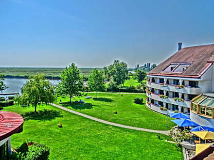 Das ist ein HDR (High Dynamic Range) Foto der wunderschönen Gartenanlage mit Liegewiese zwischen Seehotel Rust und Neusiedlersee.
