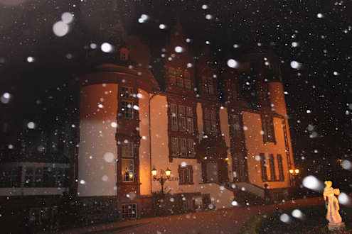 Außenansicht bei Schneefall am Abend