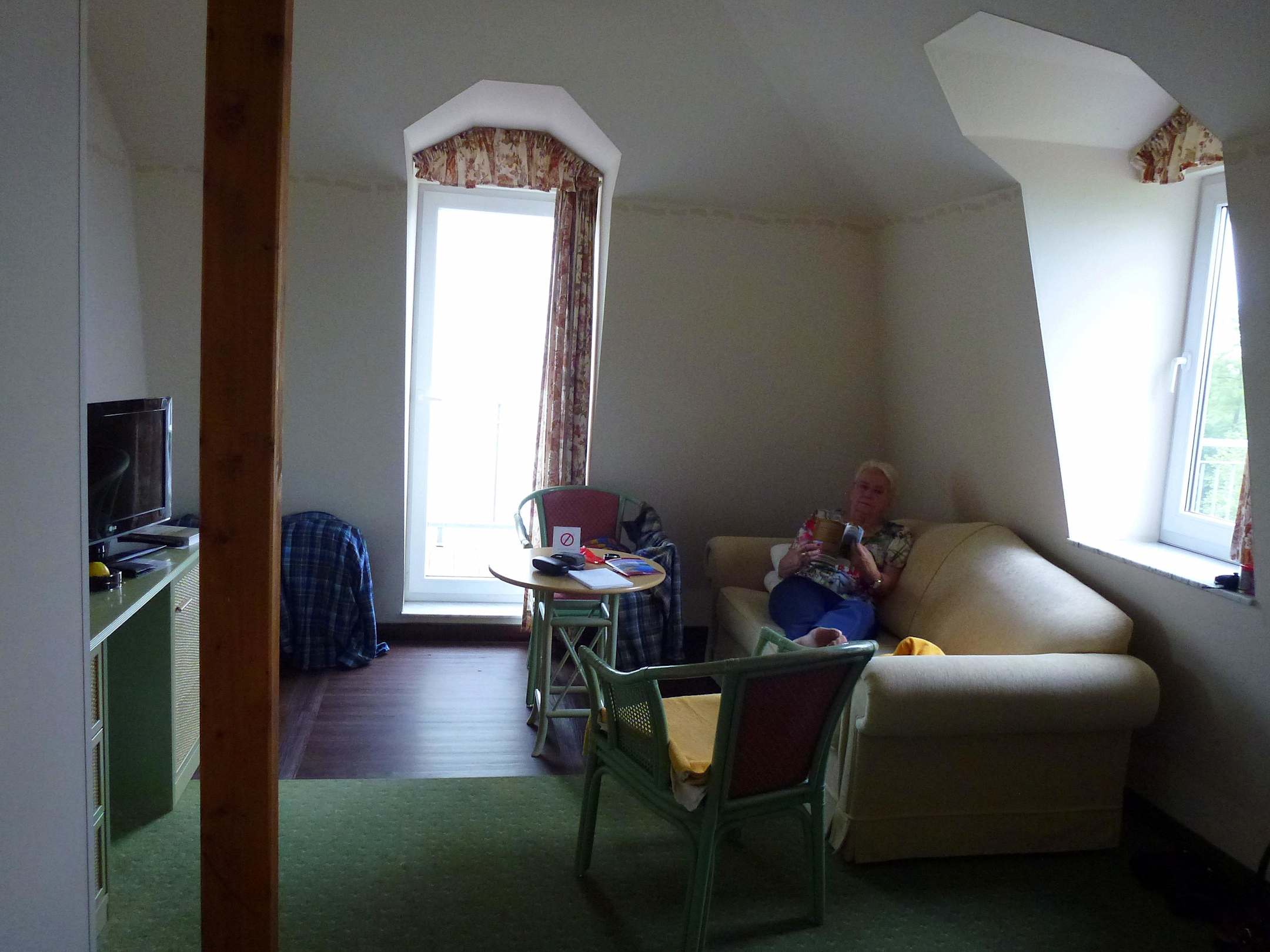 Innenansicht des Dachzimmers als Ersatz für Zimmer mit Seeseite.Keine Möglichkeit , die Fenster nachts zu öffnen, da keine Fliegendrahtgitter vorhanden