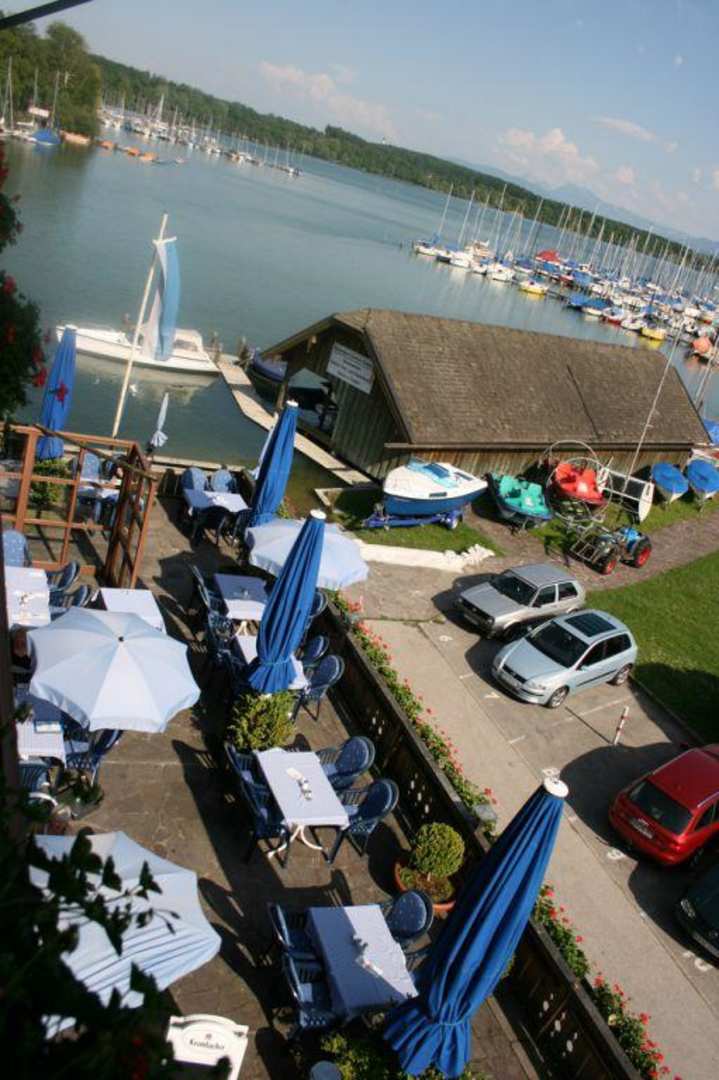 Blick auf Terrasse, Bootshaus und See