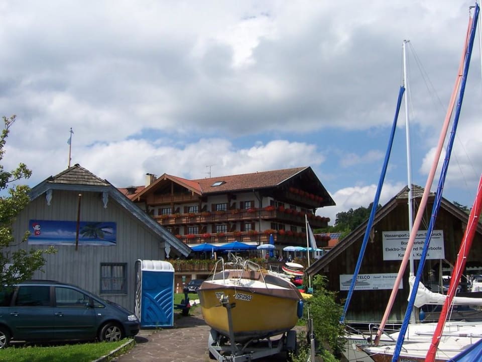 Blick vom Bootssteg zum Hotel