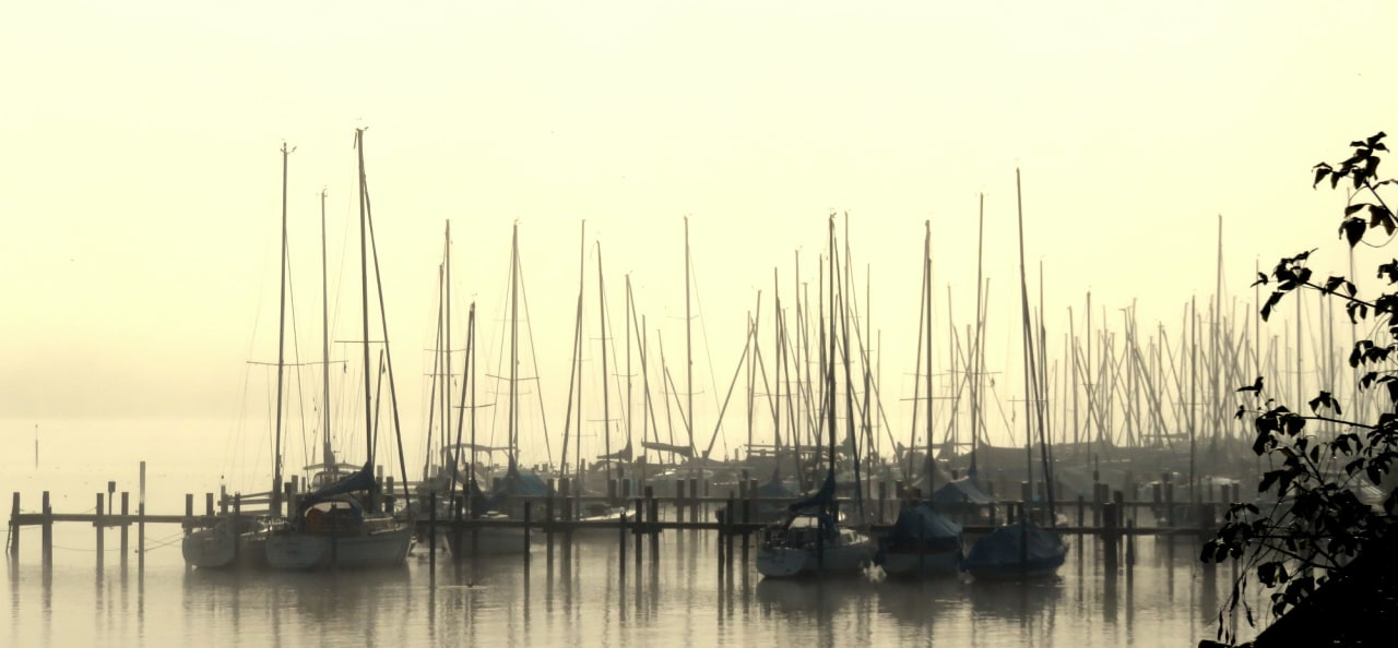 Boote im Nebel vor dem Hotel