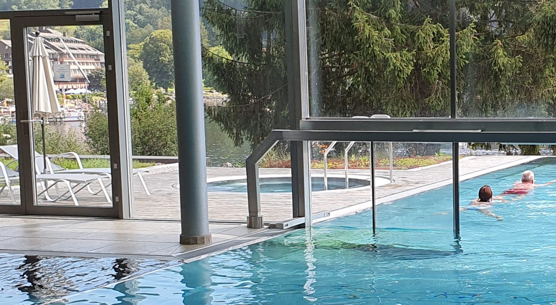 PoolIm Bild, auf dem Wasser Spiegelung Grünspan Belag Außenpool, linke Seite Blickrichtung Titisee. Außen Whirlpool Seehotel Wiesler