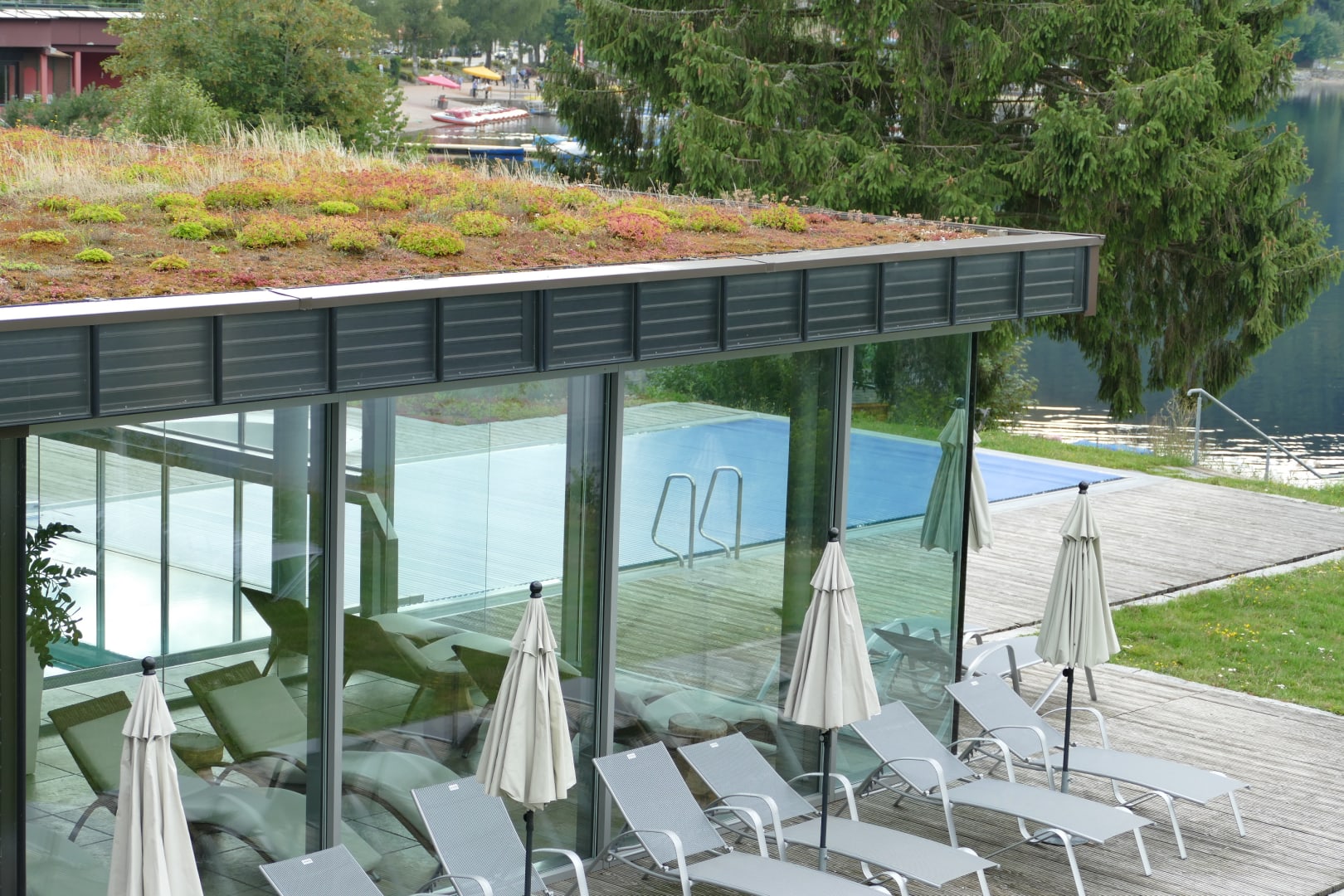 AusblickAusblick von Terrasse Zimmer auf Außenpool / Liegen / hinter Glasschieben ein weiterer Wellness Raum, Seehotel Wiesler
