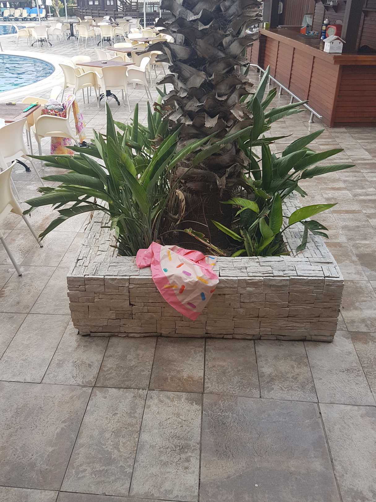 ein kaputter schwimmreifen lag bei unserer ankunft am pool ... er wanderte dann um den pool herum und landete schliesslich an unserem abreisetag ordentlich am blumentopf .. sehr fürsorglich...