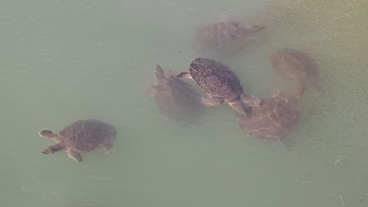 Riesenschildkröten im Fluss neben dem Hotel