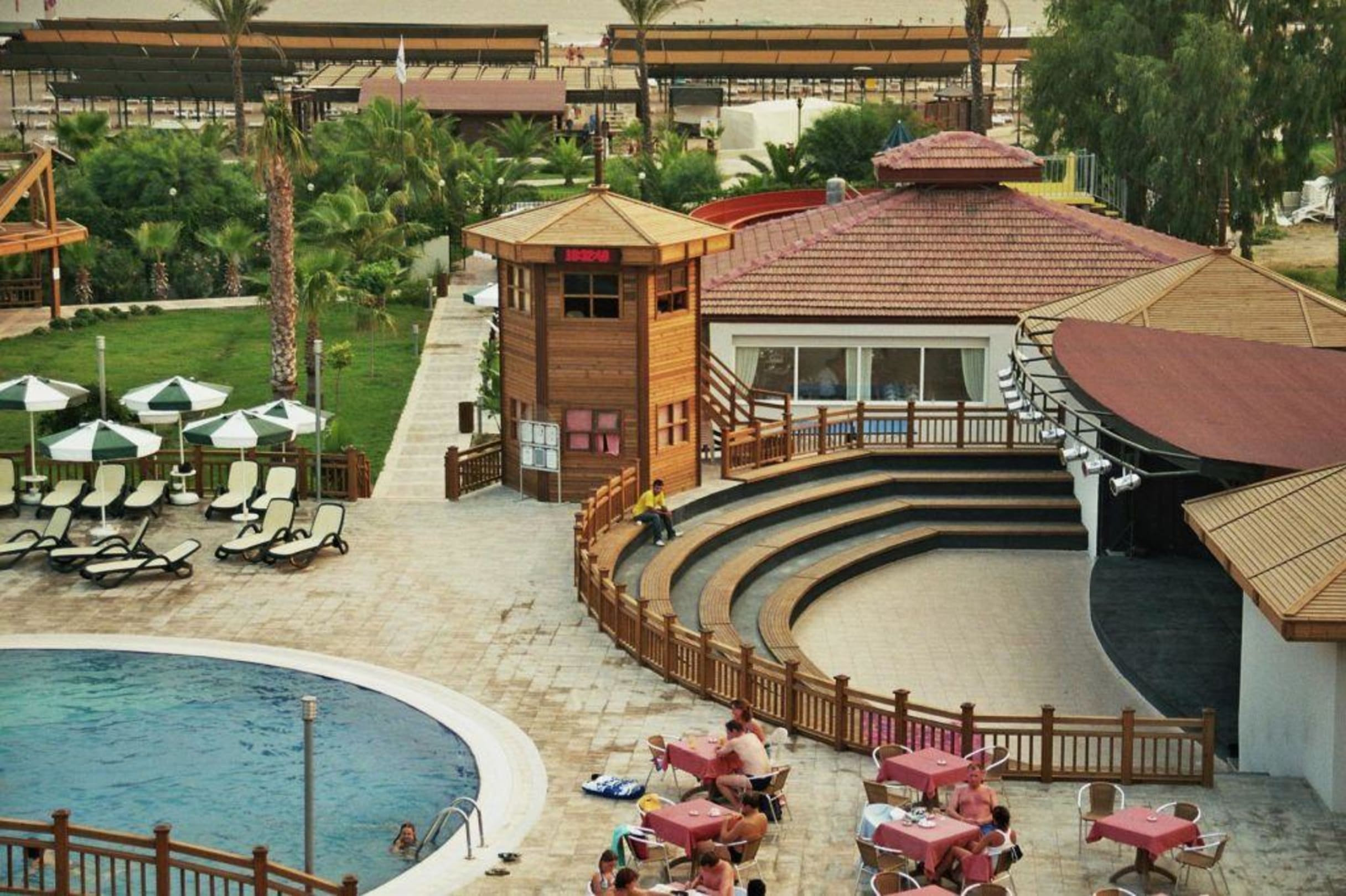 Animationsbühne mit Musikturm vom DJ, dahinter das Fischrestaurant und dann kommt nach den Rutschen gleich der hoteleigene Strandabschnitt mit Strandbar
